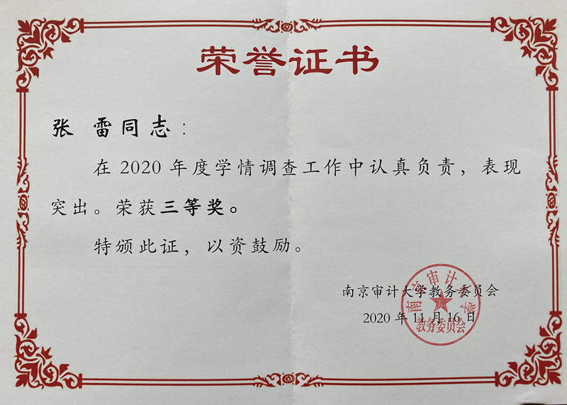 近日,成人在线观看 发布了《关于表彰2020年学情调查工作优秀组织者的决定》教发〔2020〕1号,我院张雷老师获得三等奖。