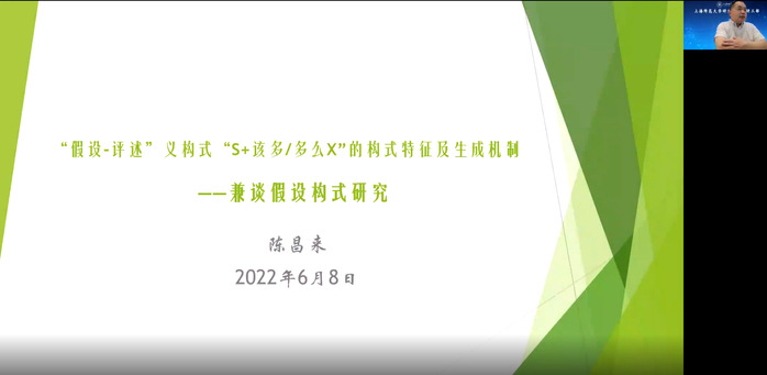 6月8日19:00,上海师范大学党委常委,研究生院常务副院长兼研工部部长,二级教授、博士生导师陈昌来教授于腾讯会议做题为“‘假设-评述’义构式‘S+该多/多么X’的构式特征及生成机制考察——兼谈假设构式研究”的学术讲座。本次讲座面向全校师生展开,包括成人在线观看 汉语国际教育系教师在内的160余人参加会议,讲座由成人在线观看 副院长(主持)朱军教授主持。