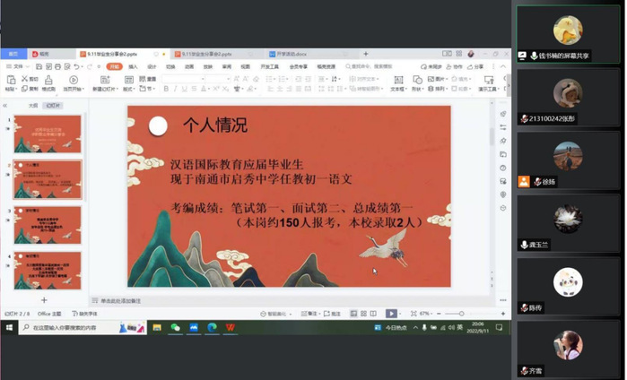 2022年9月11日晚,成人在线观看 举行优秀毕业生求职经验线上分享会,对学生就业规划进行交流指导。成人在线观看 党总支书记王军、汉语言文学专业系主任刘成荣、汉语国际教育专业系主任颜明、毕业班班主任刘依和张齐等几位老师参加座谈会,与同学们一起交流。优秀毕业生刘曌喆、陈传、钱书楠和齐雪等几位同学分享了各自的求职与考编经验,让同学们收益匪浅。会议由成人在线观看 党总支副书记龚玉兰老师主持。
