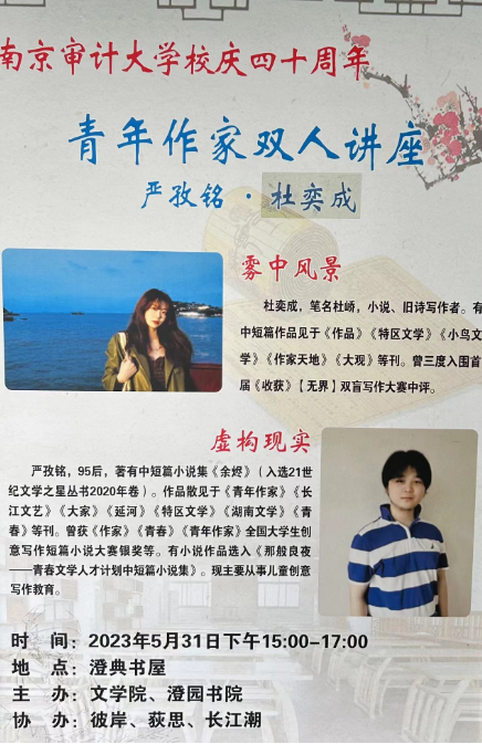 2023年5月31日下午,成人在线观看 与澄园书院联合主办,彼岸、荻思和长江潮三大文学社团协办的“写作·人生”青年作家双人讲座在澄典书屋举行,成人在线观看 汉语言文学专业18届毕业生严孜铭、2023届杜奕成联袂主讲,与大家分享成长经历和写作经验。