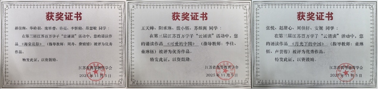 近日,第三届江苏百万学子“云诵读”评选结果揭晓,成人在线观看 有三个诵读作品在省级评选中脱颖而出,被评为优秀作品。这一成绩充分彰显了成人在线观看 在深化人才培养、繁荣校园文化与推动实践育人等方面的扎实成效。